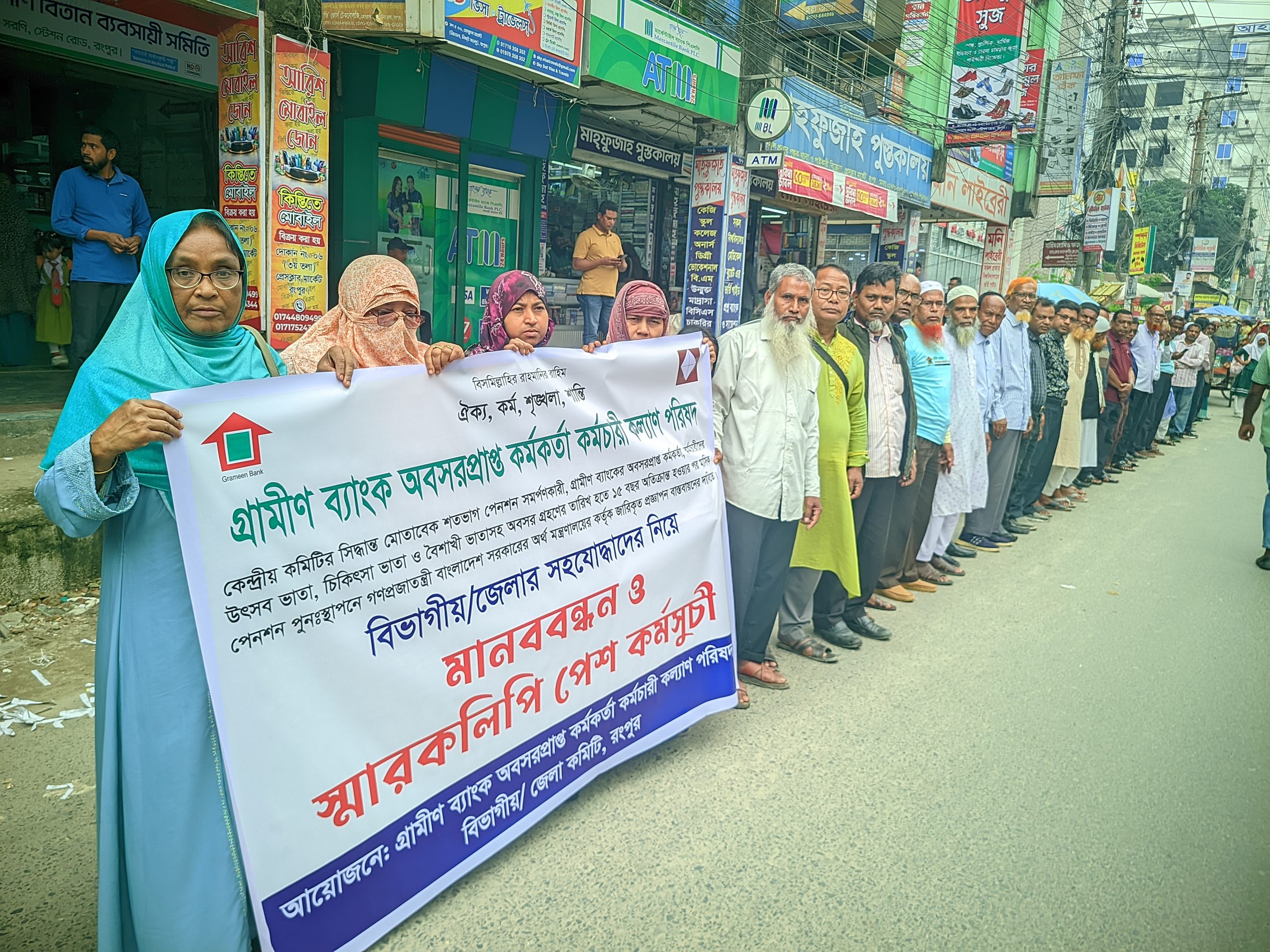 গতকাল মঙ্গলবার সকালে নগরীর প্রেসক্লাব এলাকায় আয়োজিত মানববন্ধনে অবসরপ্রাপ্ত গ্রামীণ ব্যাংক কর্মকর্তা-কর্মচারী কল্যাণ পরিষদের রংপুর বিভাগের নেতৃবৃন্দ ও সদস্যরা অংশ নেন।