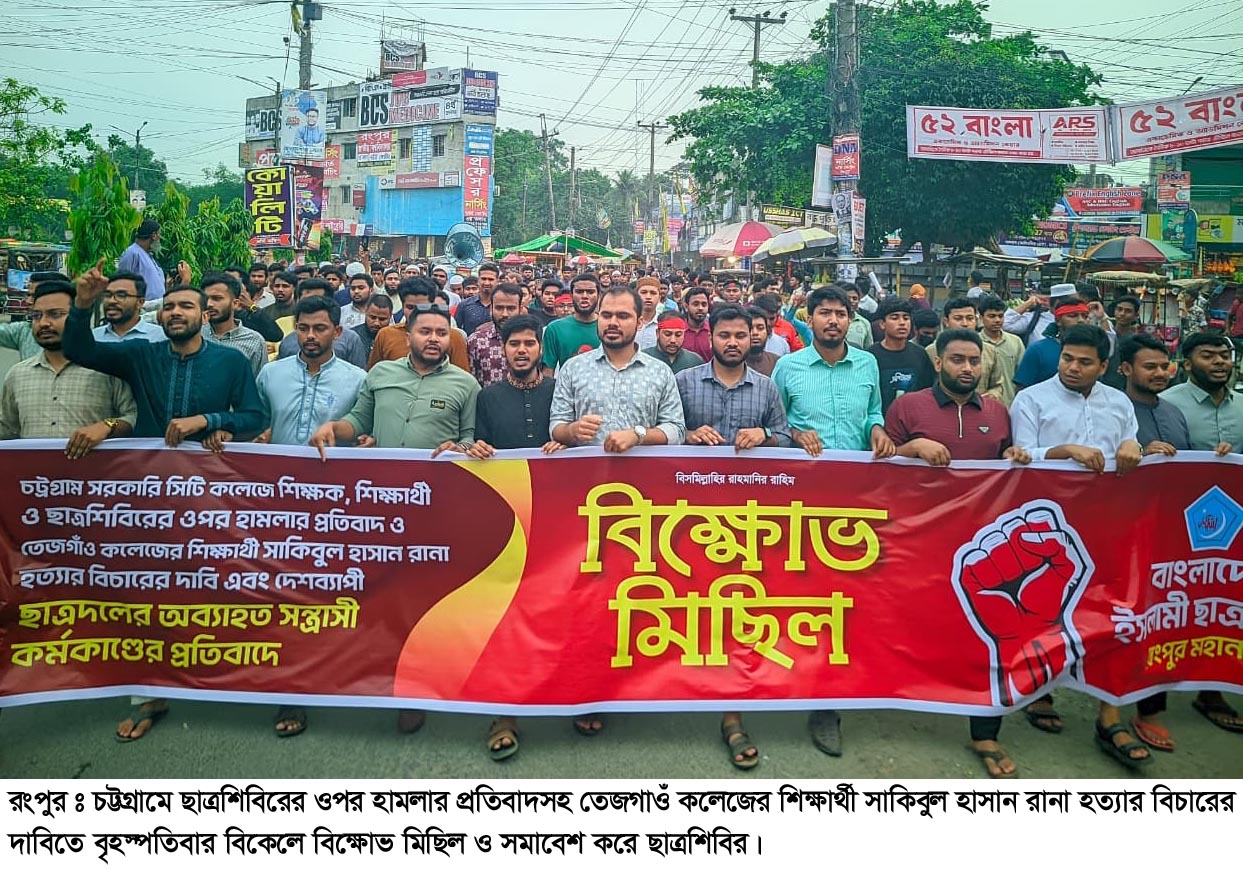 চট্টগ্রামে ছাত্রশিবিরের ওপর হামলার প্রতিবাদসহ তেজগাওঁ কলেজের শিক্ষার্থী সাকিবুল হাসান রানা হত্যার বিচারের দাবিতে রংপুরে বিক্ষোভ মিছিল ও সমাবেশ হয়েছে। বৃহস্পতিবার (২৩ এপ্রিল) বিকেলে কারমাইকেল কলেজ প্রাঙ্গণ থেকে মহানগর ছাত্র শিবিরের একটি বিক্ষোভ মিছিল বের হয়েছে নগরীর শাপলা চত্ত্বরে গিয়ে শেষ হয়।